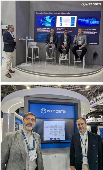 Nikolaos Bartzoudis, PI of FREE6G-Security, had the opportunity to participate in the panel session “Innovating for the Future of AI and 6G Networks,” organized by NTT DATA, a partner of the project, at its global stand for the MWC25 event. The session aimed to explore cutting-edge developments in EdgeCloud, the transformative potential of blockchain, intelligence in autonomous networks with O-RAN and SMO, and the role of AI in enhancing all these technologies. Alejandro Fernández, Telecom Director at NTT DATA (acting as moderator), Diego Rueda, Telecom Expert Consultant at NTT DATA, Shujaur Mufti, Director of Global Telco Ecosystem Architecture, and Nikolaos Bartzoudis engaged in insightful discussions and shared forward-looking perspectives on the key enablers and expected outcomes of these innovations for the future connected society.
